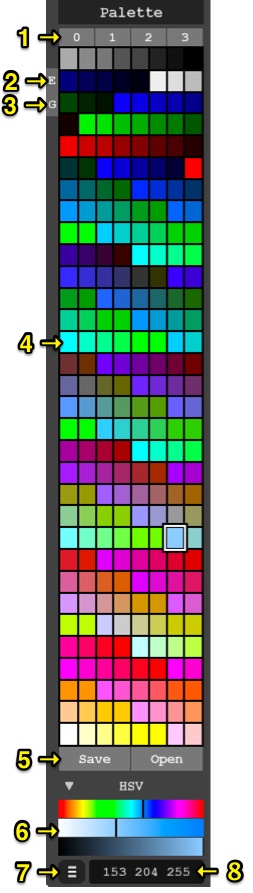 - 255 colour swatches. To create a gradient, click the first swatch, then CTRL+ALT+SHIFT drag towards the second swatch